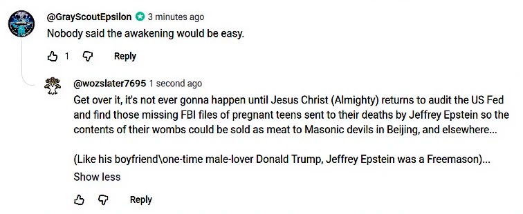 Written by wozslaterFebruary 16, 2026February 18, 2026 Who will save the children’s America? It was a baby-meat abattoir Epstein ran, mostly, tho not always, for an elite oriental clientele… Share this: Email a link to a friend (Opens in new window) Email Share on Facebook (Opens in new window) Facebook Print (Opens in new window) Print Share on LinkedIn (Opens in new window) LinkedIn Share on Tumblr (Opens in new window) Tumblr Like Loading... Related Leave a comment Cancel reply